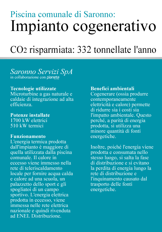 Mentre a livello nazionale e internazionale proseguono le campagne per il risparmio energetico, con il suggerimento per enti pubblici, aziende e privati cittadini di usufruire delle nuove possibilità offerte dalle moderne tecnologie, a Saronno su questo fronte siamo già “avanti”: l’impianto di cogenerazione funziona a pieno ritmo.