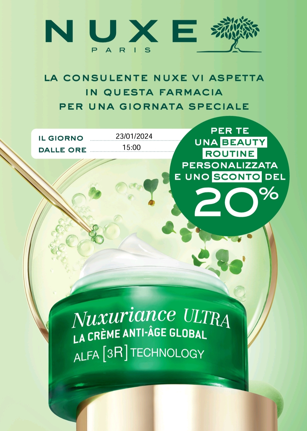 Il 23 Gennaio SCONTO -20% su Tutta NUXE in occasione della Presentazione della Linea ULTRA; Acquistandone due Prodotti avrai il Massaggiatore ICE - ROLLER in OMAGGIO.